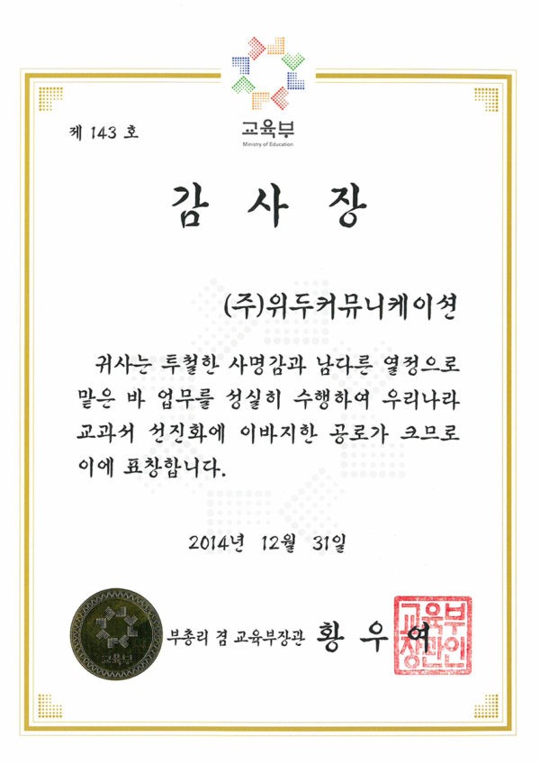 감사장 제 143호 페이지 정보 작성자 WeDu 댓글 0건 조회 6,004회 작성일 19-05-30 19:33 본문 2014-12-31 감사장 제 143호 교과서 선진화 부총리 겸 교육부장관 황우여 List Previous산업통상자원부 표창장 19.05.30 Next한국여성벤처협회 표창장 19.05.30
