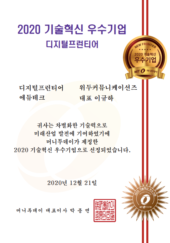 2020 기술혁신 우수기업 페이지 정보 작성자 WeDu 댓글 0건 조회 6,157회 작성일 21-12-31 12:58 본문 2020-12-21 2020 기술혁신 우수기업 디지털프런티어 에듀테크 머니투데이 대표이사 List Previous2020 소년한국 우수 어린이 도서 선정 21.12.31 Next2020 서울산업진흥원 2020 DMC어워드 21.12.31